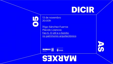 Derradeiro encontro da actividade de NUMAX, «Dicir as marxes», o xoves 13 de novembro ás 20h. O arquitecto Plácido Lizancos e o antropólogo Íñigo Sánchez-Fuarros clausurarán o ciclo cun evento que leva por título «Feo ti. O útil e o bonito no patrimonio arquitectónico». Esta actividade está comisariada pola Libraría NUMAX e subvencionada pola Deputación da Coruña.